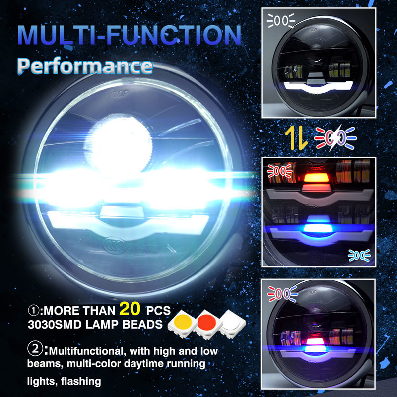 High-performance 5.75-inch motorcycle headlight assembly featuring bright LED projection with red, blue, and white options. Rated at 45W with 4800LM output for superior visibility.