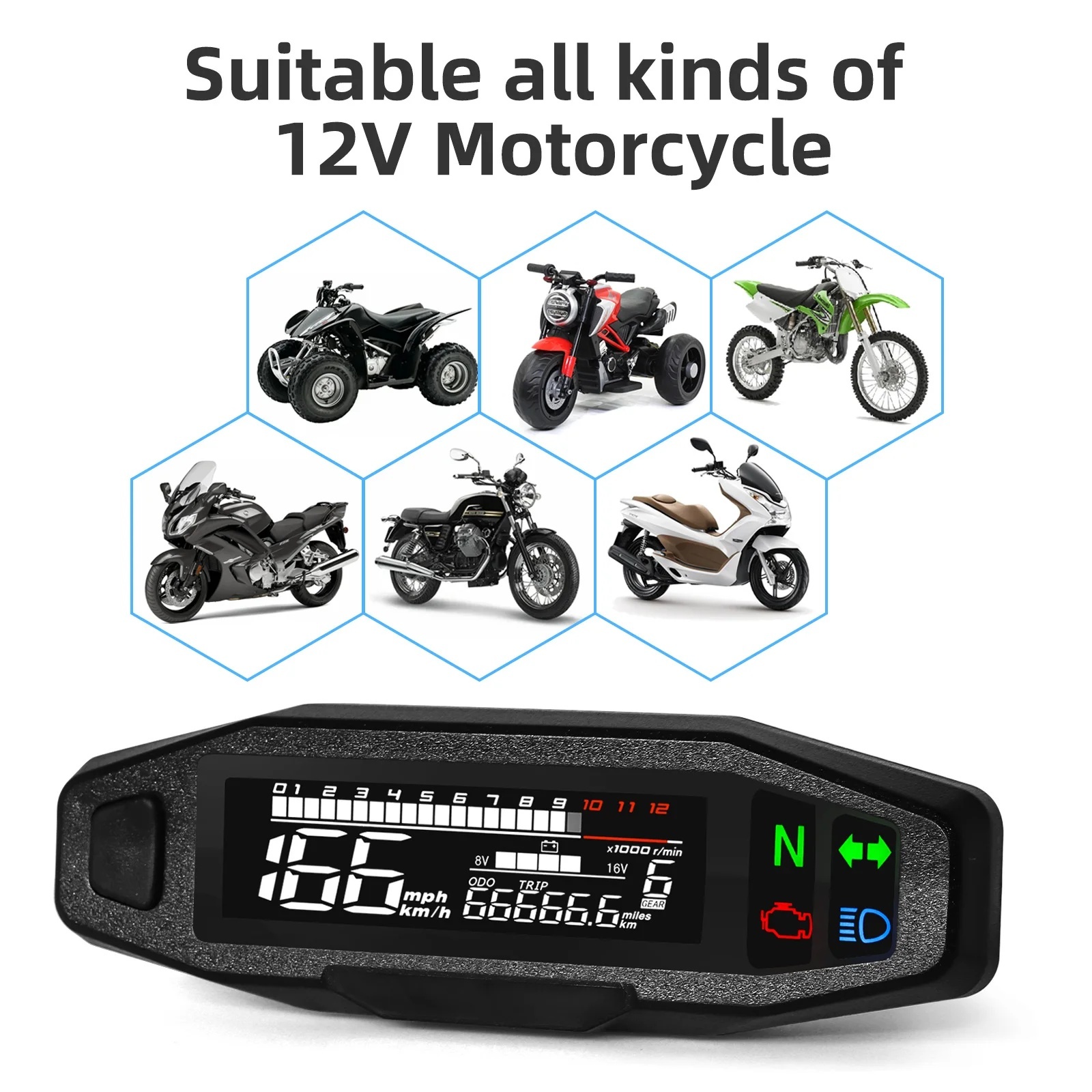 4उन्नत बहुक्रियाशीलताः मोटरसाइकिल उत्साही लोगों के लिए एक पूर्ण समाधान के रूप में डिजाइन किया गया, यह मीटर डिस्प्ले एक ओडोमीटर, स्पीडोमीटर और टैकोमीटर के रूप में कार्य करता है,एक ही समय में कई महत्वपूर्ण मीट्रिक की निगरानी करने में सक्षम.